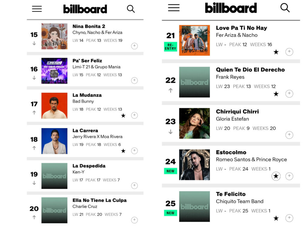 El dato más destacado llega con “Niña Bonita 2”, que alcanza 19 semanas consecutivas dentro de Billboard Tropical Airplay, logrando un pico en la posición No. 13. La permanencia del tema lo convierte en uno de los registros más importantes en la carrera de Fer Ariza y lo posiciona dentro de una conversación relevante entre artistas colombianos que han logrado estancias prolongadas en este chart.